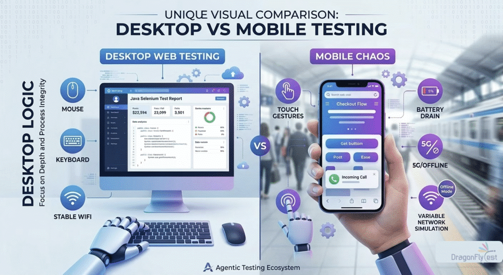 Desktop web testing and mobile app testing are genuinely different disciplines. Not just in tooling — in thinking. The way users interact, the kinds of failures you get, and the things you need to check are different enough that a strategy built for one will have real blind spots on the other.